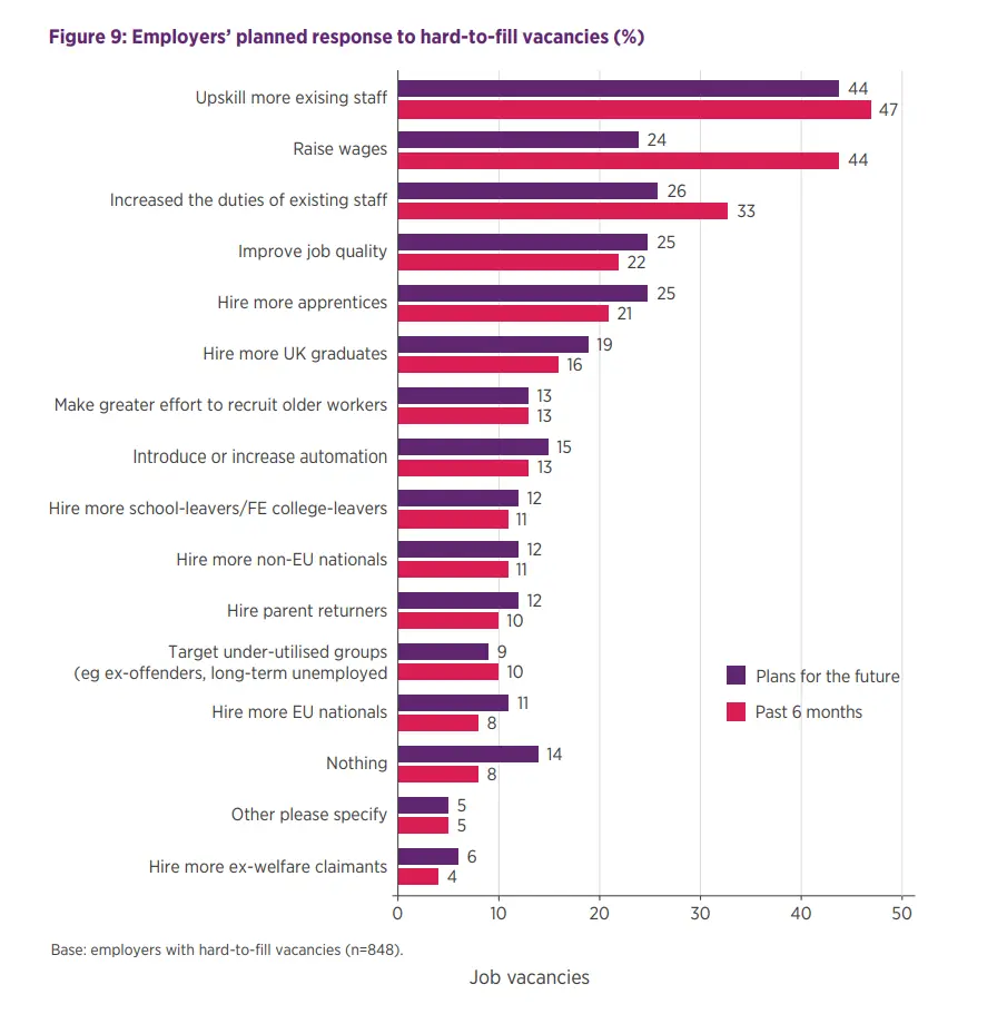 According to a Survey made by CIPD, 46% of recruiting employers have hard-to-fill vacancies. The top response to hard-to-fill vacancies has been to upskill existing staff (47%), followed by raising pay (44%), which is up from 29% in the previous quarter. However, fewer employers plan to raise wages in the future in response to hard-to-fill vacancies (24%).