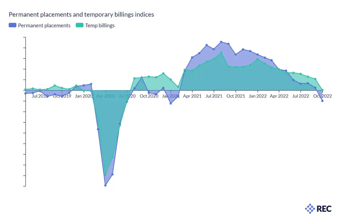 According to the latest KPMG and REC report on UK Jobs compiled by S&P Global, recruitment across the UK weakened at the start of Q4. In response to heightened uncertainty over the economy, recruiters who took part in the aforementioned survey reported a decline in permanent placements and stagnant temp billings. Additionally, both permanent and temporary job openings declined in the past week, as the permanent placement fell for the first time in 20 months.